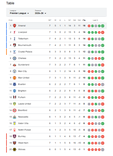 HomeSports And EntertainmentArsenal Tops English Premier League (SEE FULL TABLE) Sports And Entertainment Arsenal Tops English Premier League (SEE FULL TABLE) By TheNewsGiant October 4, 2025 0 4 FacebookTwitterPinterestWhatsApp TagsArsenalEnglish Premier LeagueEPL FacebookTwitterPinterestWhatsApp TheNewsGiant Previous articleAtiku Slams Tinubu For Visiting Plateau To Make Merry Not Sympathise With Terror VictimsNext articleDeclan, Bukayo Score As Arsenal Whip West Ham United 2-0 (FULL COMMENTARY) RELATED ARTICLES Sports And Entertainment Late Goal By Chelsea’s Estevao Drowns Liverpool 2-1 Sports And Entertainment Mason, Sesko Goals Fire Man United To Beat Sunderland 2-0 Sports And Entertainment Osimhen Overcomes Injury To Play In Nigeria’s Make-Or-Break World Cup Qualifiers (SEE FULL LIST) Sports And Entertainment Declan, Bukayo Score As Arsenal Whip West Ham United 2-0 (FULL COMMENTARY) LEAVE A REPLY Cancel reply Comment: Please enter your comment! Name:* Please enter your name here Email:* You have entered an incorrect email address! Please enter your email address here Website: Save my name, email, and website in this browser for the next time I comment. Δ Must Read Late Goal By Chelsea’s Estevao Drowns Liverpool 2-1 Sports And Entertainment Mason, Sesko Goals Fire Man United To Beat Sunderland 2-0 Sports And Entertainment Gov Abdulrazaq Blames Predecessor Saraki For Terrorists’ Killings In Kwara News Senator Omisore Launches Osun Governorship Bid General Dangote Cement Truck Kills 5 Tricycle Occupants In Ogun News