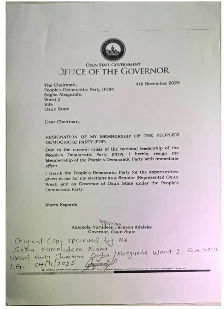 Tendering his resignation from the party, the Governor wrote a letter dated November 4, 2025 to the party Chairman of Sagba Ward 2 in Ede, in which he attributed the crisis in the party as the reason behind the governor’s decision.