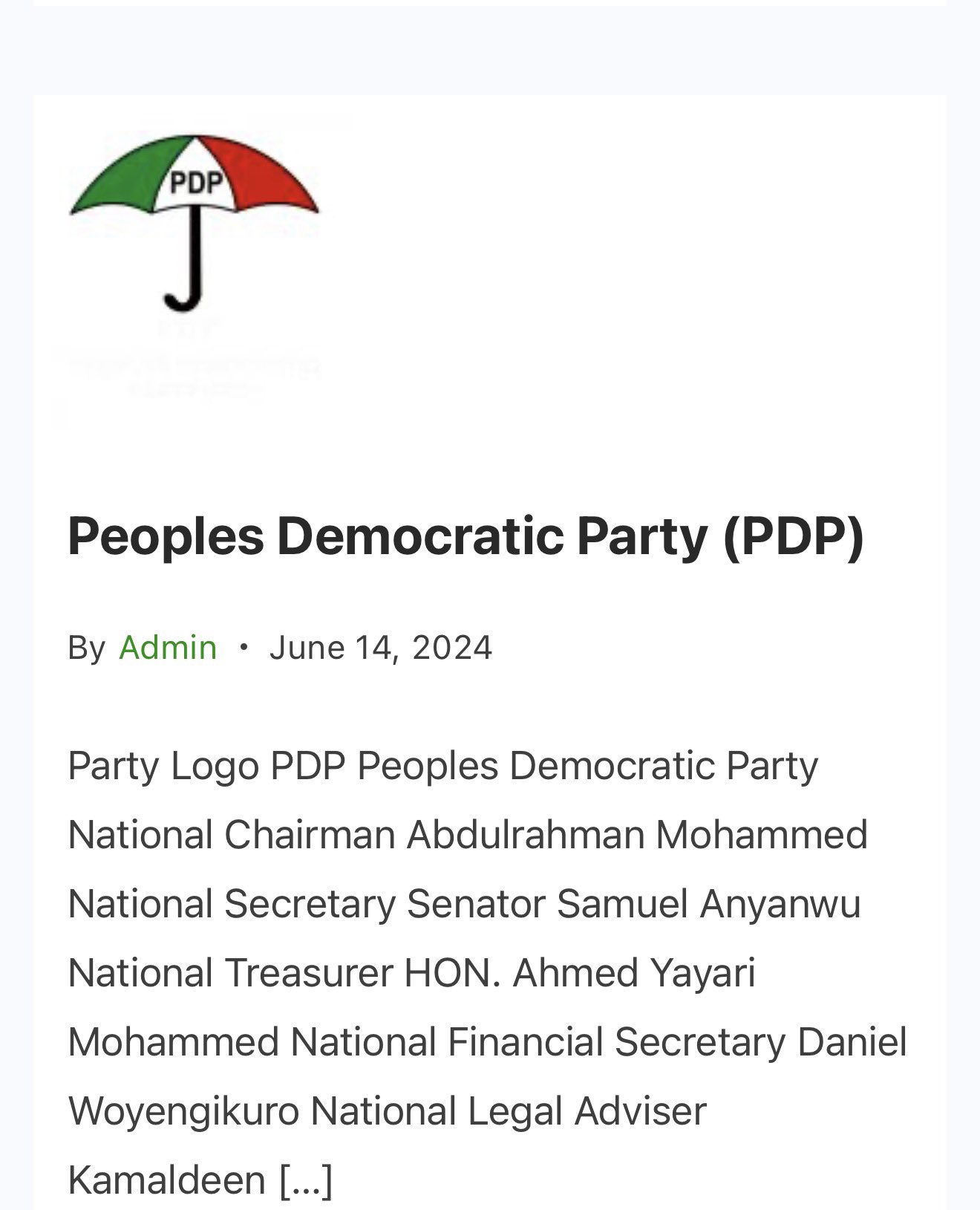 Its website has now been updated with Hon. Abdulrahman Mohammed as PDP National Chairman, and Senator Samuel Anyanwu as National Secretary.