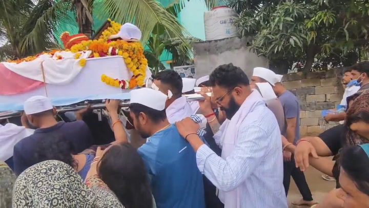 Ramesh’s mother walked with the coffin in a blue sari along with other mourners, as he held it on his right shoulder.