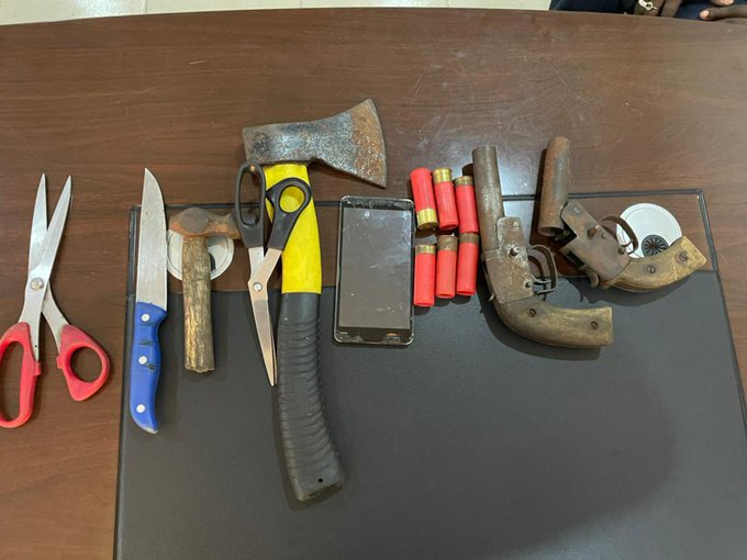 No suspect was found there but the following were recovered: 2 locally made pistols, 6 live cartridges, 1 battle axe, 1 hammer and 2 scissors.