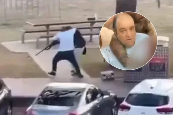 The same attacker is later seen on the bridge picking up another weapon and firing again.