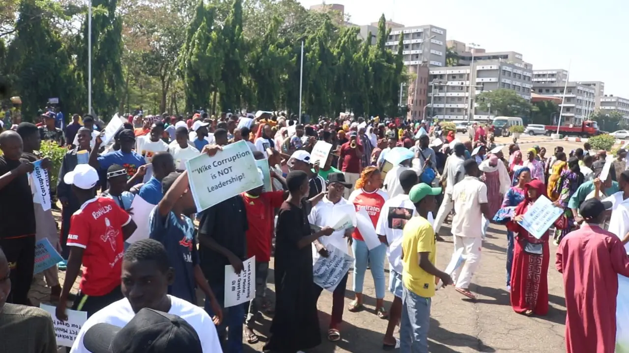 Thousands of indigenes and residents of the Federal Capital Territory on Wednesday, stormed the streets of Abuja to the National Assembly in a massive protest aimed at calling for the sack of Nyesom Wike as Minister.